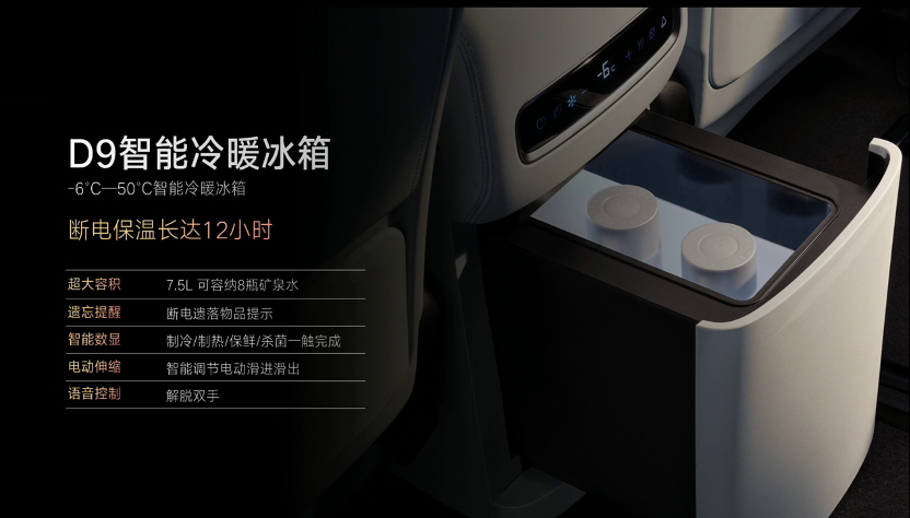 此外,腾势D9还特别配备了断电后能保温12小时的智能冷暖冰箱等,不管是冰镇食品还是冬季热饮,这款冰箱都能从容应对,非常实用。