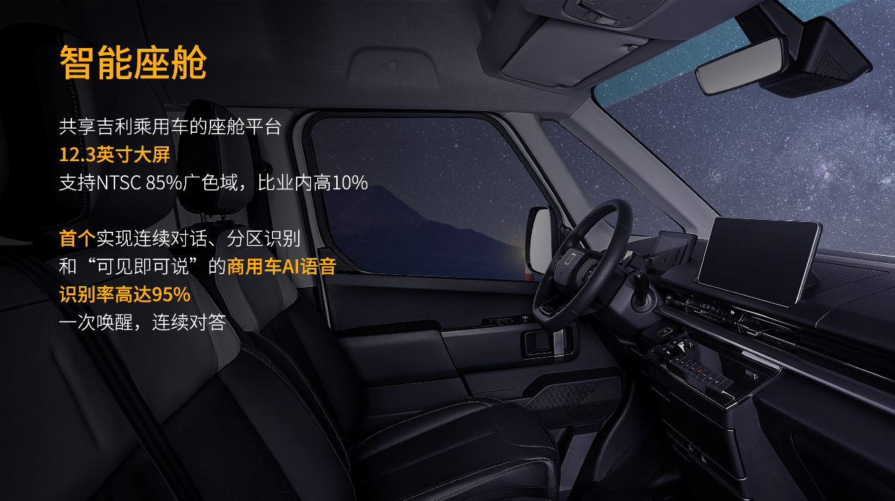智能化是定义电动大VAN的核心标准,远程超级VAN充分共享吉利在电子电气架构方面的优势积累,在智能座舱、智能驾驶、智能货舱三方面都有着出色的表现。12.3英寸中控大屏,拥有首个实现连续对话、分区识别和“可见即可说”的商用车AI语音。30项智能安全配置,行业首搭ADDW高级分心预警功能,打造高性价比、高可靠性的自动驾驶系统。除此之外,远程超级VAN还创新性的为使用者打造了智能货舱——货物卫兵系统,它可以对货舱重量及货物状态进行监测,提升运输效率,保障货物安全。