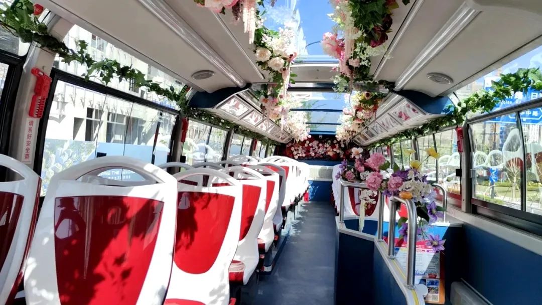 来到“赏花专线”的车厢,仿佛置身于“移动花展会场”,与浪漫花海撞个满怀。月季、蝴蝶兰、玫瑰……车厢扶手、通道、车窗乃至隔板等部位,无处不被各色花束精心装点,春花锦色扑面而来。