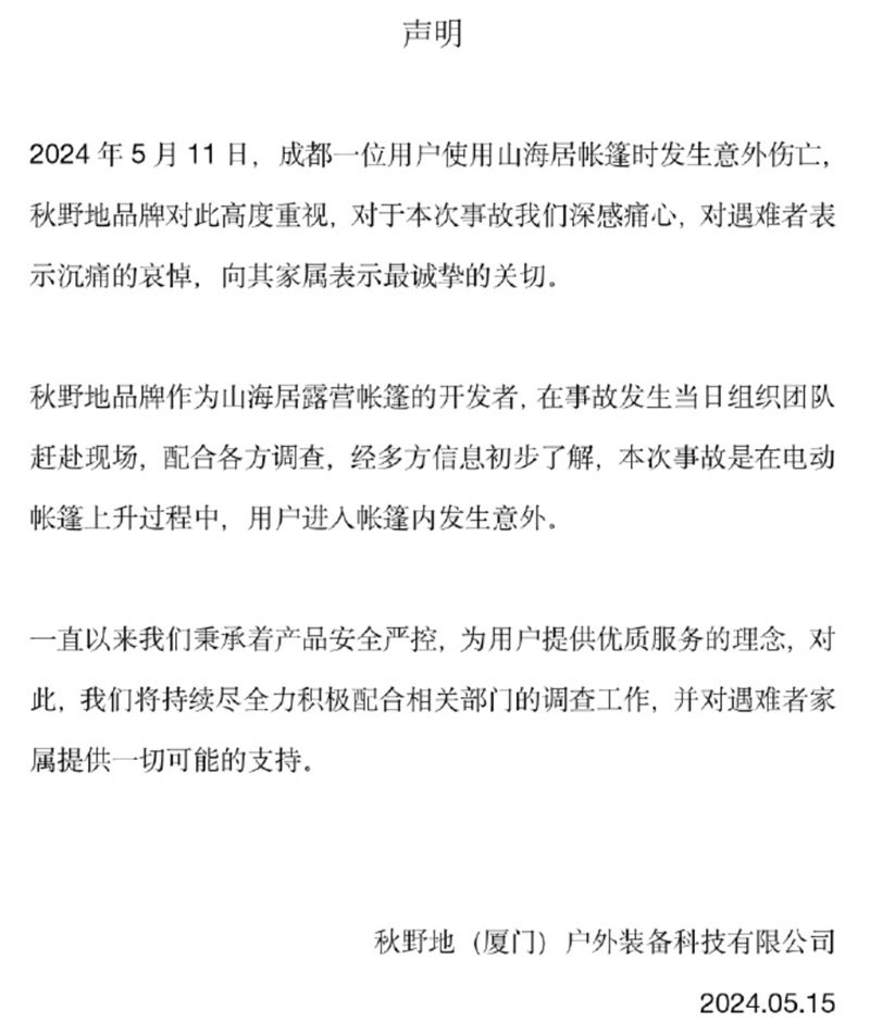 同日,秋野地品牌也发表声明如下:“秋野地品牌作为山海居露营帐篷的开发者,在事故发生当日组织团队赶赴现场,配合各方调查,经多方信息初步了解,本次事故是在电动帐篷上升过程中,用户进人帐篷内发生意外。”