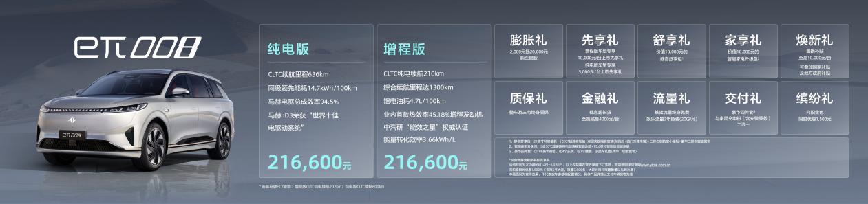 除此以外,更有上市先享礼至高1万元、膨胀礼2000元抵扣20000元购车尾款的限时现金优惠,综合优惠后,eπ008增程版车型到手价仅需18.86万元。同时,用户还可享受置换补贴1万元的焕新礼;整车及三电终身质保的质保礼;低息超长贷,至高贴息4000元/台的金融礼;基础流量终身免费及娱乐流量3年免费(20G/月)的流量礼;豪华四件套或家用充电桩(含安装服务)二选一的交付礼;向阳金色限时优惠1500元的缤纷礼等丰富礼遇。
