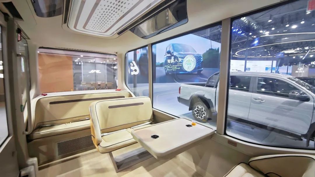 该款无人驾驶巴士外观设计全新升级,采用小立柱、大视窗的结构,优化了车内观光视线,采用4+2+4座椅布局并融合阶梯式前低后高设计,为乘客带来更加舒适的乘坐与观光体验,不仅进一步拓宽了公共交通出行的全新边界,更为用户带来科幻般的乘车交互体验。