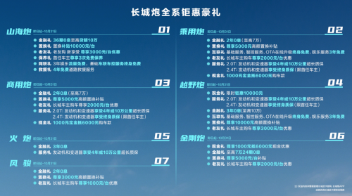 用户购买越野炮,可尊享限时优惠10000元、置换补贴10000元、金融贴息3年0息等钜惠福利;购买乘用炮、商用炮、金刚炮,尊享限时优惠1000元抵6000元、置换补贴5000元等超值优惠。全家族钜惠,诚意十足,价值拉满!