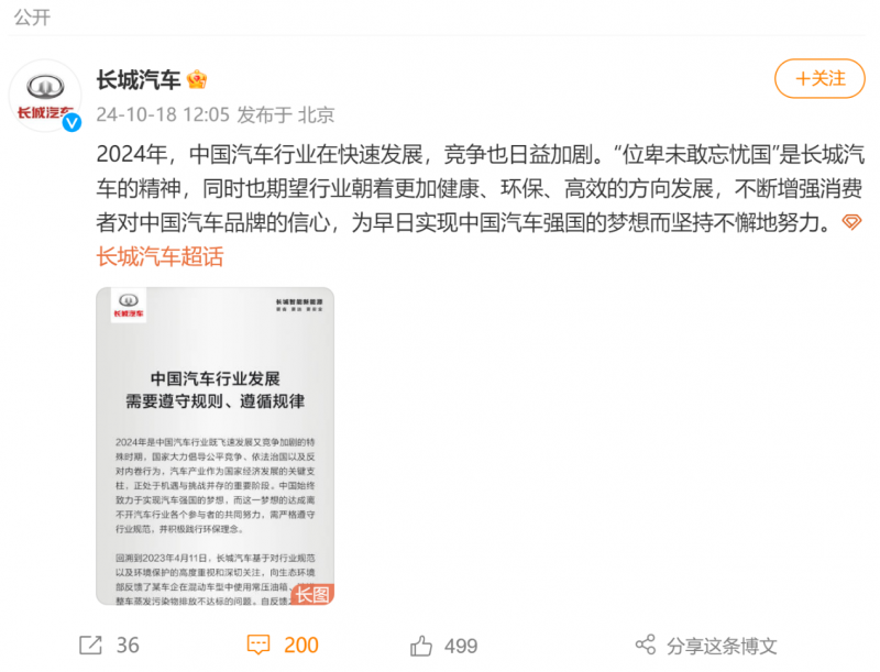 10月18日,长城汽车官方微博发布长文,题为《中国汽车产业发展需要遵守规则、遵循规律》。对汽车人而言,汽车不止是产品,更是关乎消费者福祉与国家工业强盛的事业。中国车企不仅仅是在参与一场商业竞争,更是在为国家支柱产业走向的未来铺路。
