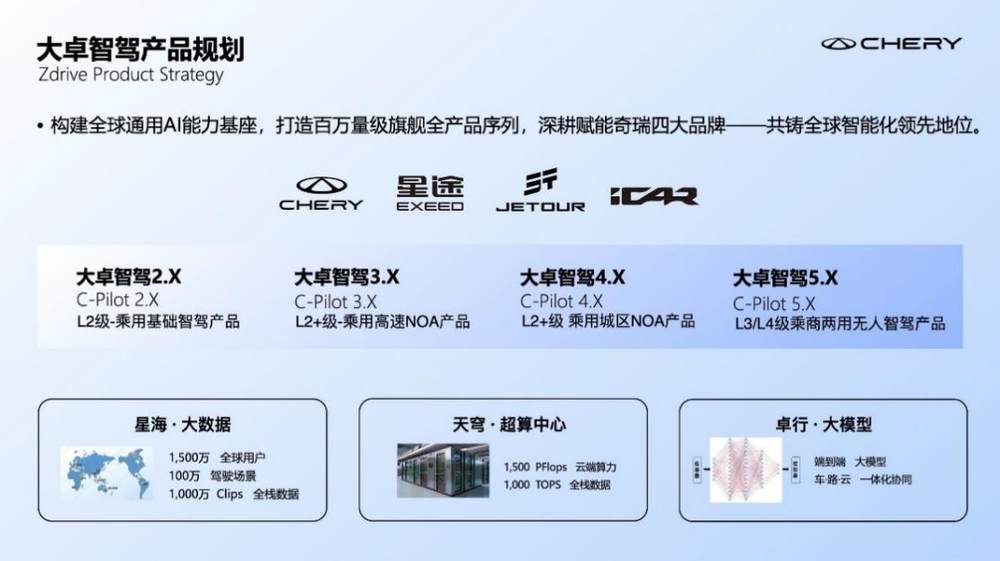 奇瑞希望通过大卓智驾来打造智能化的新灵魂,基于奇瑞多元化的品牌市场,构建智驾产品定义,形成从技术到用户的全链路闭环。因此,大卓智驾坚持以“安全智能灵动出行”为产品理念,基于奇瑞各品牌用户智能出行的需求和特点,依托于全球通用的三大技术底座:星海大数据、天穹超算中心和卓行智驾大模型,搭建由基础L2到具备L4能力自动驾驶的百万量级全产品序列“货架”,深耕四大品牌和全球用户,共铸全球智能化领先地位。