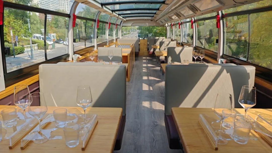 步入车内,精致的围桌式桌椅布局,不仅便于游客互动交流,更营造出温馨愉悦的氛围。值得一提的是,该观光巴士更是一间移动的美食殿堂,米其林入选餐厅、黑珍珠一钻餐厅沃夫冈牛排馆为其量身定制专属创意菜单。在这里,游客可以尽情享用美国极佳级安格斯牛慢烤肉眼、超厚焦脆培根等美食精酿,让游客一边饱览城市美景,一边品尝“新鲜出炉”的高品质美食,实现味蕾与视觉的双重享受。