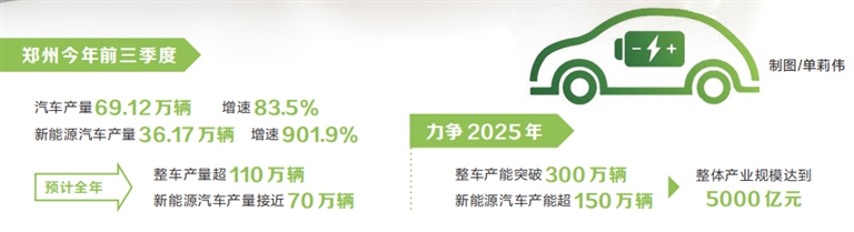 “今年前三季度,郑州汽车产量69.12万辆、增速83.5%,新能源汽车产量36.17万辆、增速901.9%。预计全年整车产量超110万辆,新能源汽车产量接近70万辆。”郑州市政府相关负责人表示,郑州正在加快建设全国重要的新能源及智能网联汽车研发和生产基地,力争2025年整车产能突破300万辆、新能源汽车产能超150万辆,整体产业规模达到5000亿元。