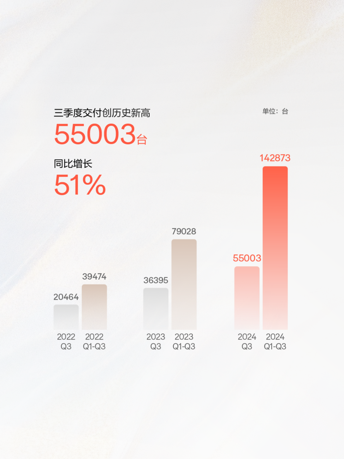 2024年前三季度,极氪累计交付新车近14.3万台,其中三季度交付突破5.5万台,同比增长51%,创单季新高。刚刚过去的十月,极氪交付突破2.5万台,创单月历史新高,同比增长92%,环比增长17%,稳居月销2万+俱乐部,1-10月交付近17万台,问鼎中国高端纯电销冠。