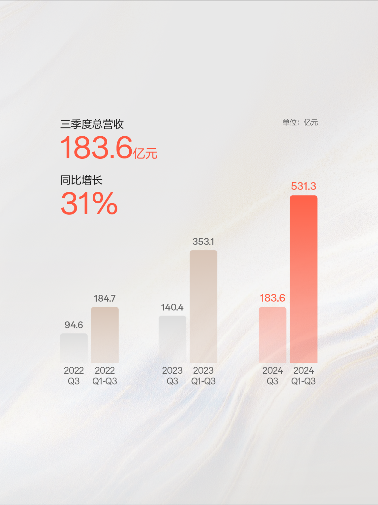 交付量提升带来了整车收入水平稳步增长,三季度极氪综合营收183.6亿元,同比大增31%,其中整车收入超144亿元,创下季度历史最高水平。前三季度,极氪累计营收达531.3亿元,已超2023全年业绩表现。