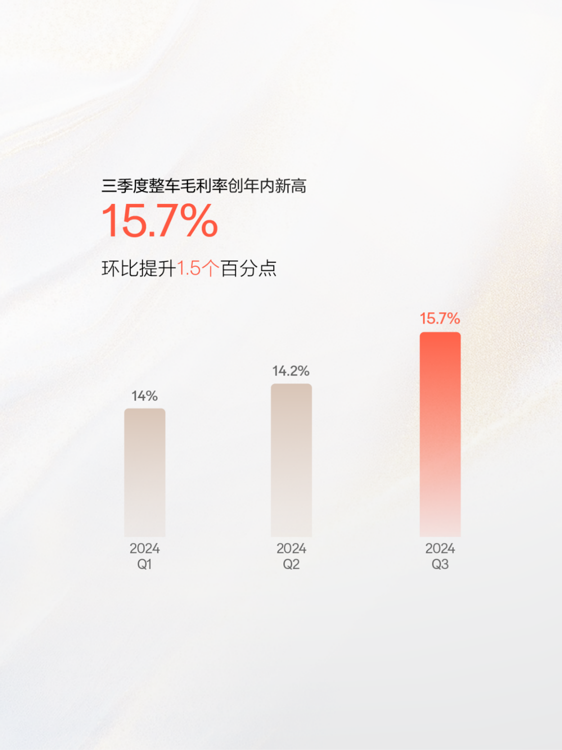 吉利控股集团总裁、极氪智能科技CEO安聪慧表示:“三季度,公司再次实现强劲且稳健的业绩表现。得益于严格的成本控制,以及持续的产品结构优化、规模效应和技术创新,整车毛利率保持上升趋势,盈利能力取得稳步进展。未来将继续整合资源,强化产品竞争力,推动公司可持续高质量增长。”