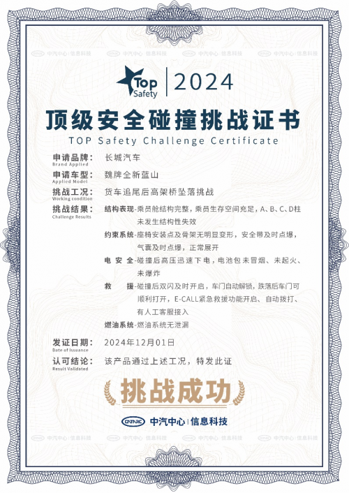 2024年12月2日-4日,在第13个全国交通安全日之际,作为长城汽车旗下高端新能源品牌,魏牌携手中汽中心TOPSafety开展了一场难度极大的“行业首个高架桥坠落挑战”。作为此次挑战的主角,魏牌全新蓝山以卓越的整车、电池、主被动、智驾等安全性能,成功通过这一极限测试,再次印证了其在安全领域的强劲实力和领先地位。