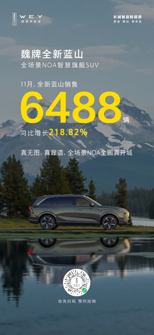 凭借全面卓越的硬核实力,全新蓝山以头部优等生的姿态披荆斩棘,持续赢得市场与用户的广泛认可与信赖,引领了大六座新能源SUV市场的发展方向。据最新销量数据显示,魏牌全新蓝山11月销售6488辆,同比增长218.82%,保持强劲增势,不断绽放中国智造高端实力的“魏牌风采”。