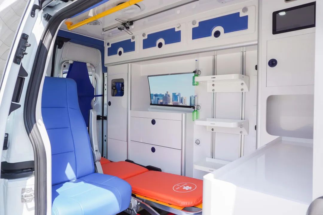 同时,为确保转运环境的明亮与清洁,安凯H6转运车内设置了长条照明灯与紫外线消毒灯。在储物空间的设计上,更是独具匠心,配置了吊柜与40L×2两种规格的氧气瓶柜,以及可移动置物板等多组模块化储物空间,能够高效分类存放各种医疗器材、患者个人物品等。用户可根据实际需求灵活调整车内布局,最大化利用空间资源。