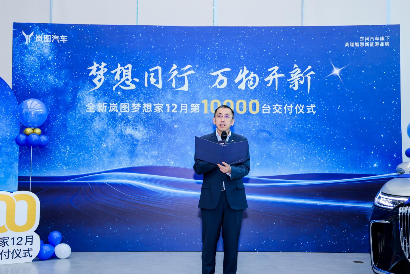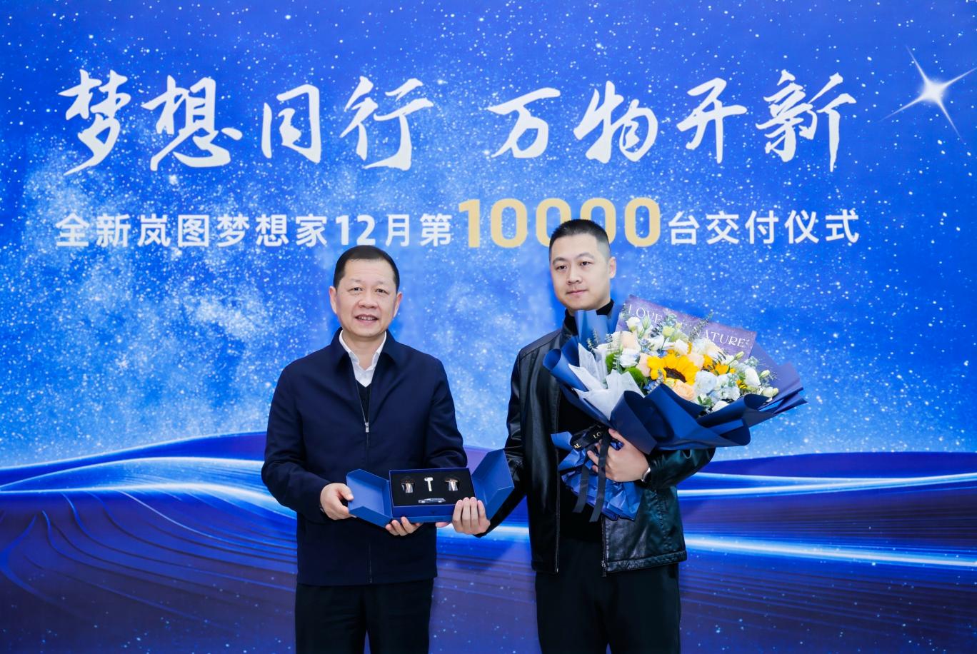 2024年12月31日,全新岚图梦想家12月第10000台交付仪式在武汉举行,东风汽车集团有限公司董事长、党委书记杨青,将全新岚图梦想家的钥匙交到岚图车主卢松手中。