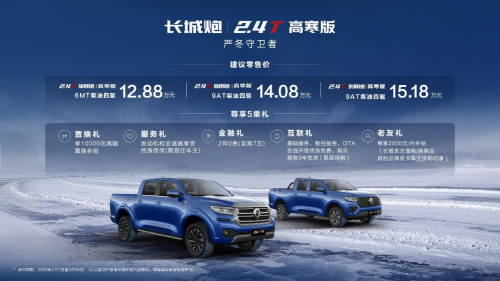 2.4T长城炮高寒版定位“中国高寒地区专属皮卡—严冬守卫者”,是为北方高寒地区用户打造的高性能专属车型,以“超燃动力、暖冬套装、冠军品质”的硬核产品实力,打造全新驾乘体验。购车用户还将尊享10000元置换礼、2年0息(至高7万)金融礼、2000元/台补贴老友礼等五重大礼,诚意十足,价值拉满。