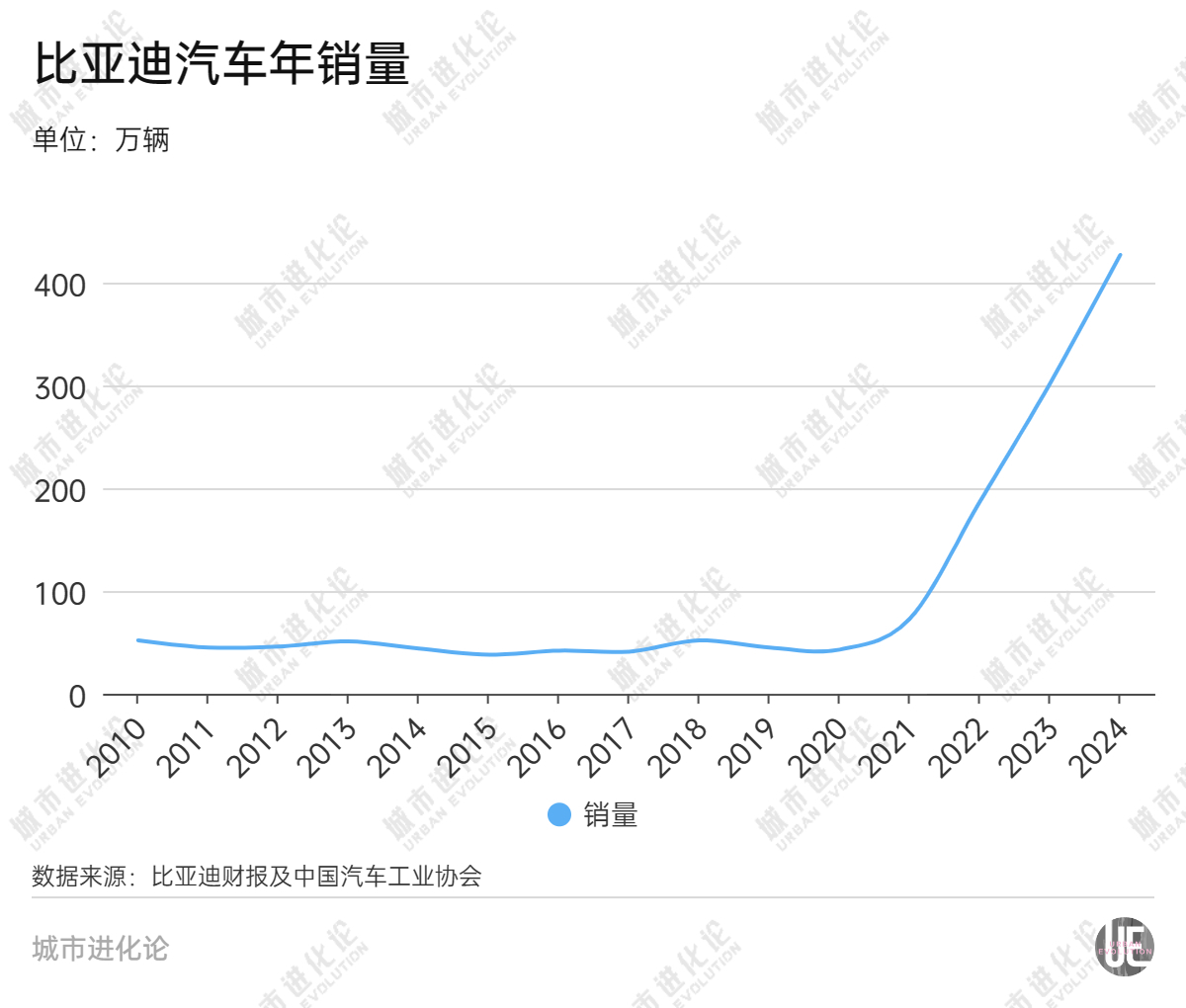 事实上,虽然比亚迪自2003年起就开始生产汽车,但真正崛起是在2021年之后。2021年之前,比亚迪的汽车销量还在50万辆左右,但2021年之后以惊人的速度持续飙升:2021年至2024年,比亚迪汽车销量分别达到73万辆、187万辆、302万辆、427万辆,是四年前的近10倍。