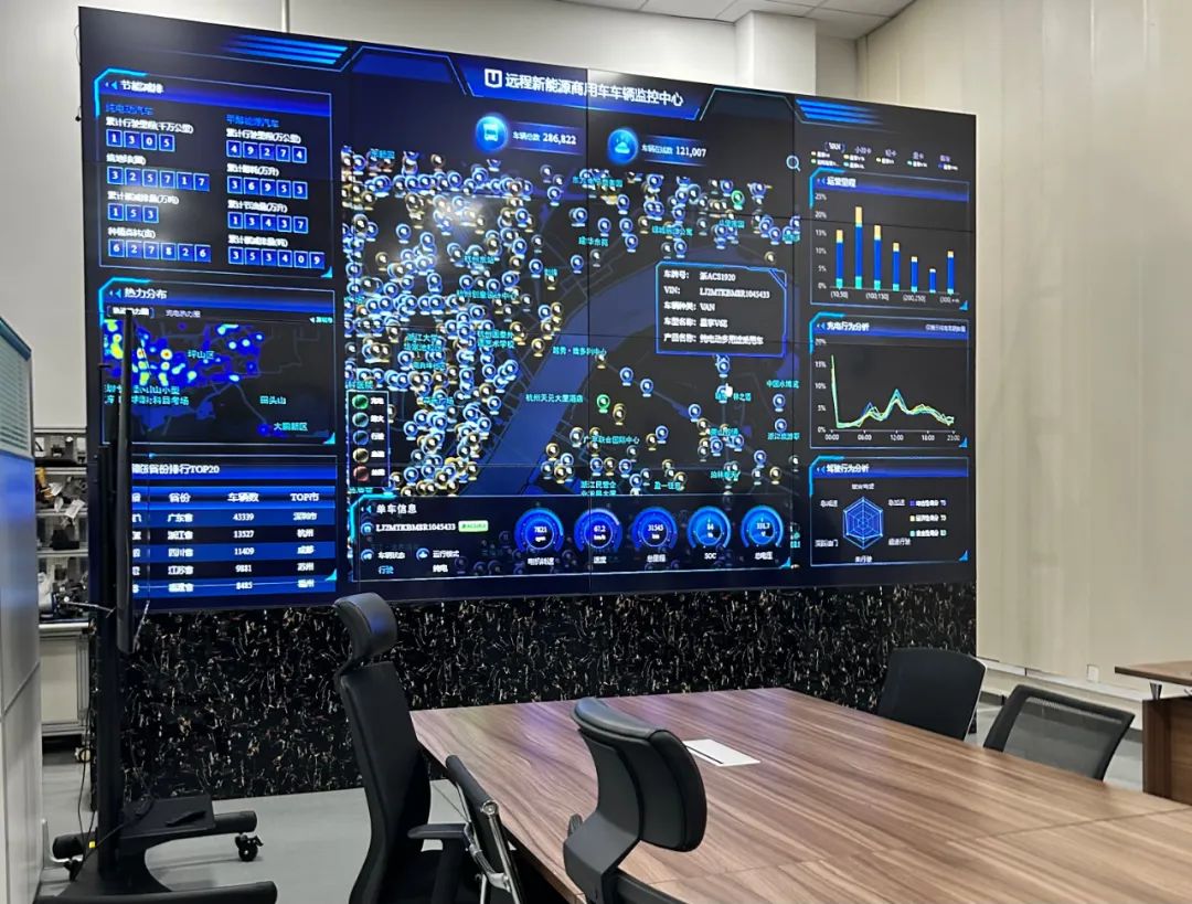 远程新能源商用车车辆监控中心的大屏幕显示屏显示一辆运行的甲醇重卡已经累计行驶4万公里