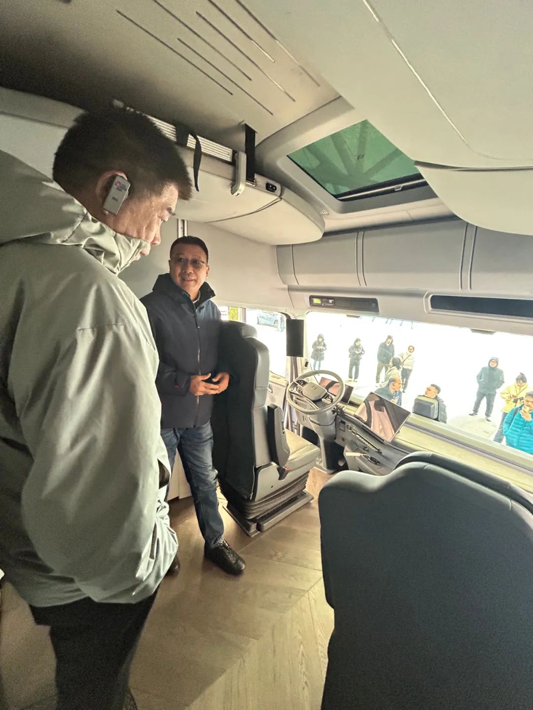 在吉利远程新能源商用车研究院的现场,记者登上了一辆远程星瀚G超级电动牵引车,进入驾驶室,立刻被其超大驾乘空间所吸引,驾驶室高足有2米,平地板、宽大双卧,简直就是一个超级商务舱。坐上座椅,感觉非常舒适,技术人员介绍,这是因为配备气囊减震,可以有效缓解驾驶者的疲劳;方向盘转向轻便,单手可轻松操作;12.3英寸双屏联动,智能语音交互,操控更轻松安全;配备270°全景影像,盲点监测,疲劳监测,双碰撞预警等智驾辅助,整车NVH大幅提升,较油车驾驶室更安静。据驾驶员反馈,单日长途驾驶疲劳感明显降低:“智慧座舱舒适性很不错,一趟长途跑下来,几乎没有腰背酸痛的烦恼。”