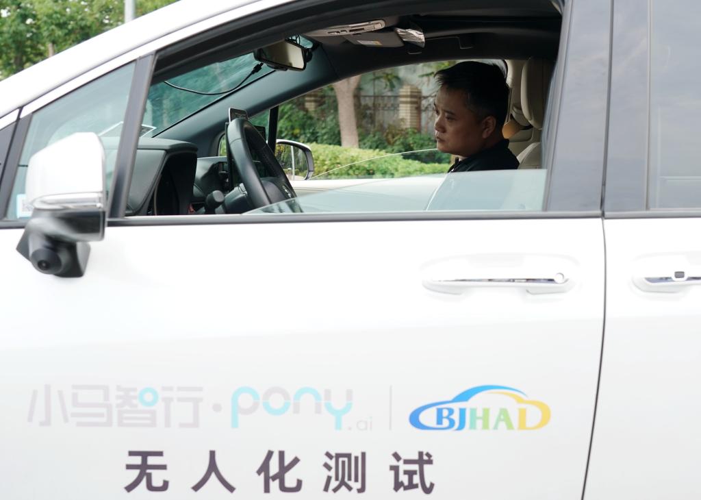 ■在北京亦庄的自动驾驶示范区内,工人在一台自动驾驶测试车辆内进行车载设备的道路测试。(新华社记者张晨霖摄)