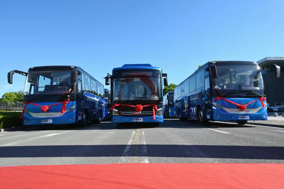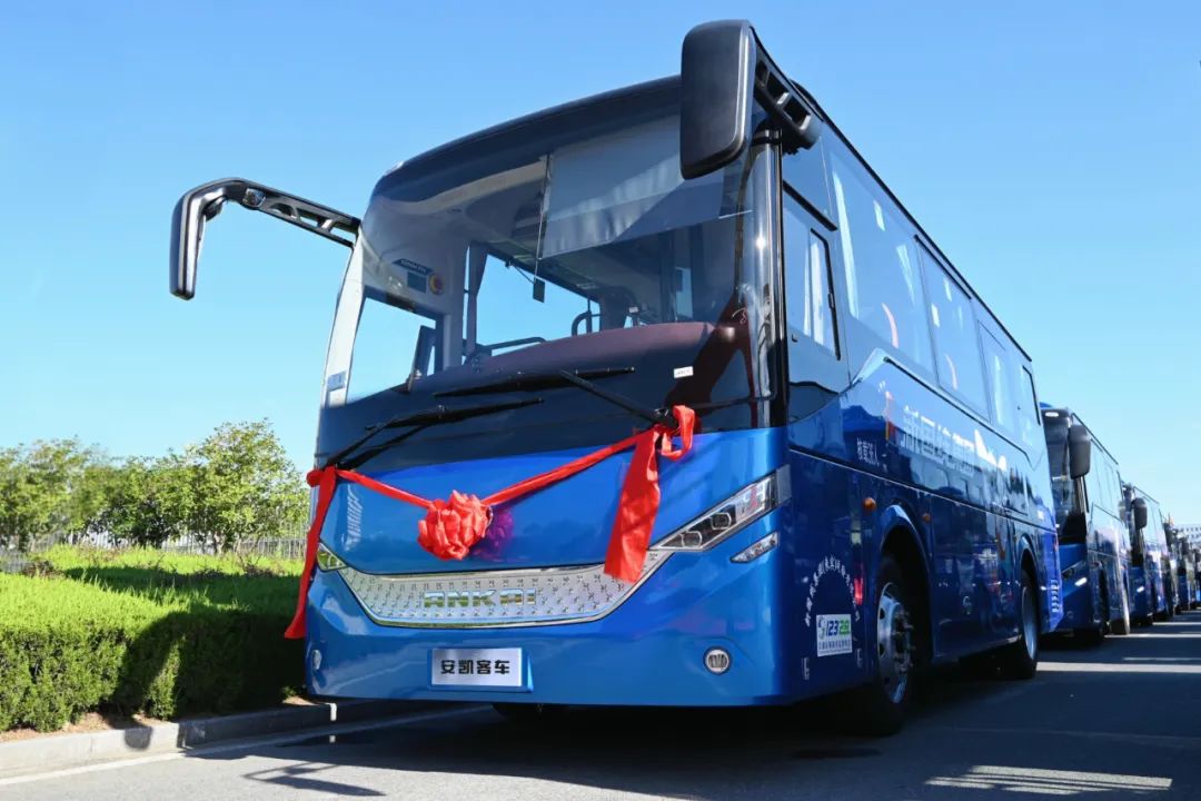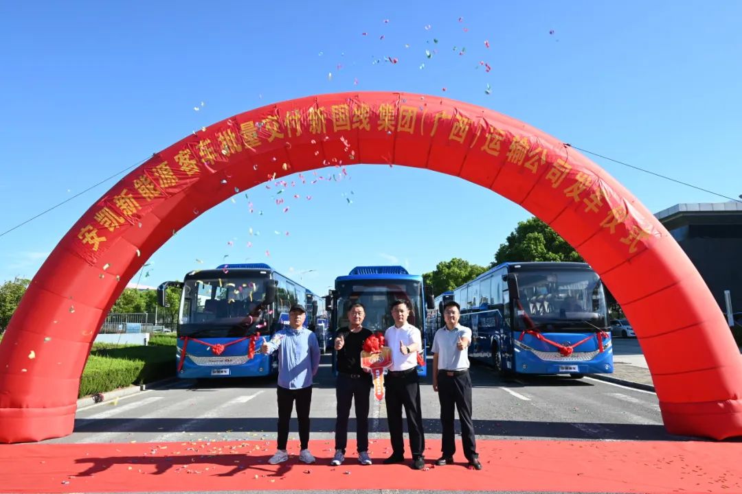 同心再聚,喜讯再传!8月20日,伴随着热闹喜庆的氛围,一辆辆崭新的安凯E70、N82E无站立公交以及高端舒适的安凯N11E客车,身披象征荣誉与祝福的大红花,正式驶出安凯厂区大门,交付给新国线集团(广西)运输有限公司(以下简称“新国线广西公司”)。