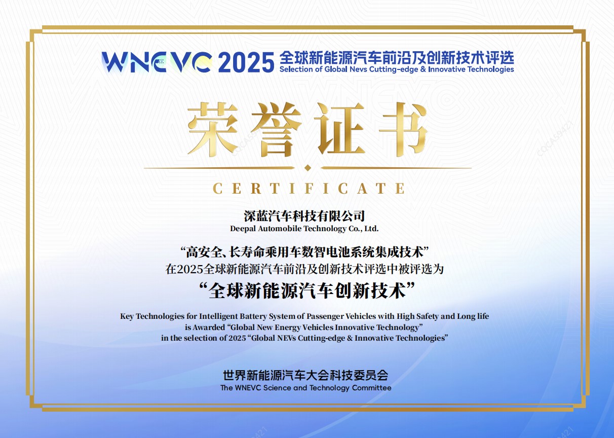 技术创新是深蓝汽车的核心竞争力,也是其推动中国汽车产业从“跟跑”迈向“领跑”的关键动力。在本届大会“全球新能源汽车前沿及创新技术评选”中,深蓝汽车“高安全、长寿命乘用车数智电池系统集成技术”获评“全球新能源汽车创新技术”,这已是深蓝汽车连续三年在该大会中获此殊荣。回溯过往,2023年其“基于脉冲加热的动力电池快速升温关键技术”、2024年“高性能长寿命增程式燃料电池汽车动力系统技术”先后登顶,三次获奖不仅彰显了深蓝汽车深厚的技术积淀,更体现了其持续迭代的创新动能。