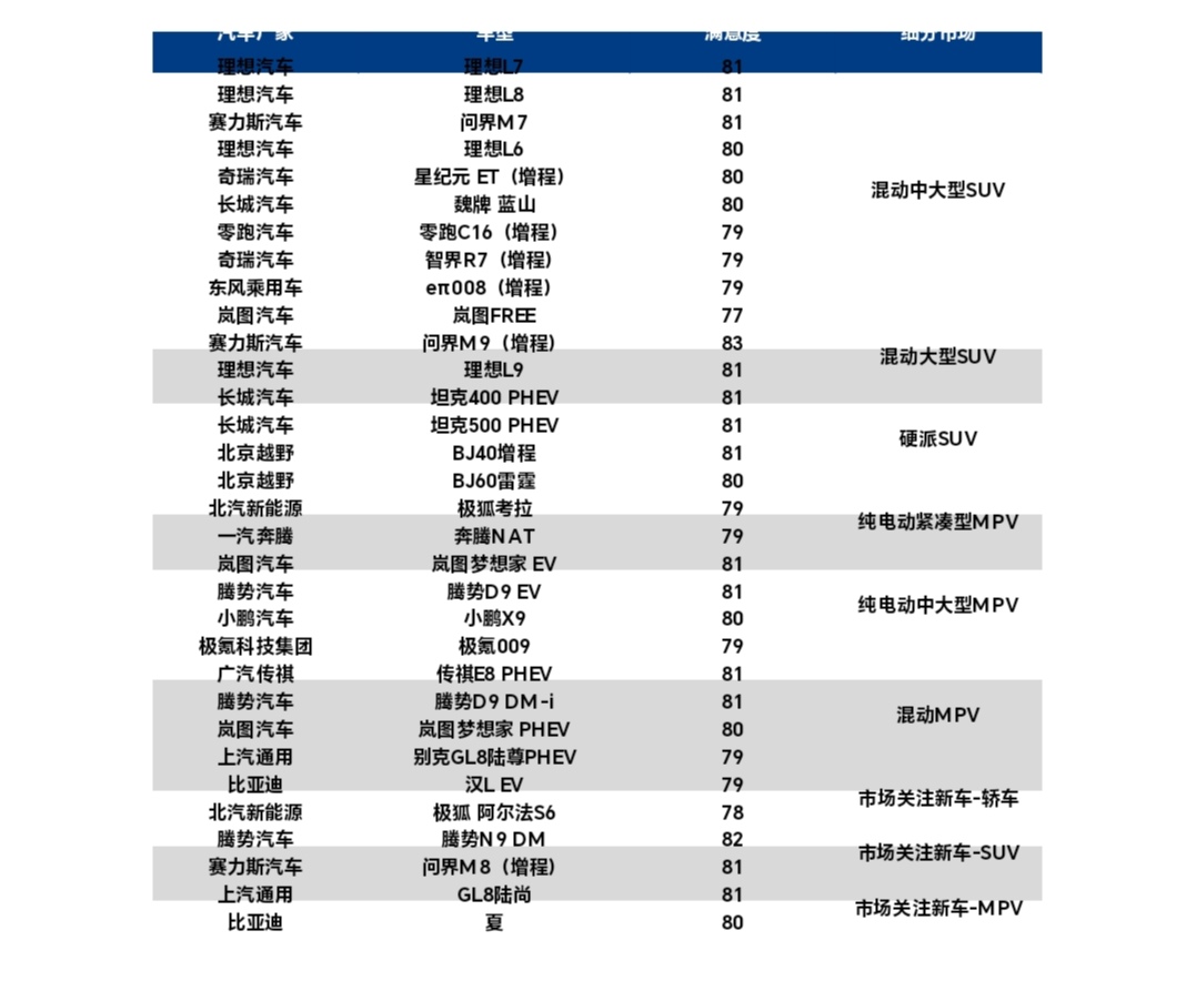 以新能源类别及车型结构类别综合划分细分市场车型,各细分市场NEV-CACSI(新能源汽车综合满意度指数)第一(含并列第一)的车型是: