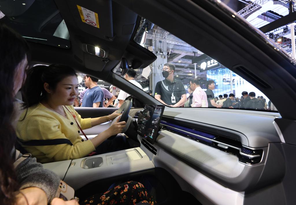 2025年4月26日,第二十一届上海国际汽车工业展览会上,参观者在小鹏G6展车内体验车载智能系统。新华社记者方喆摄