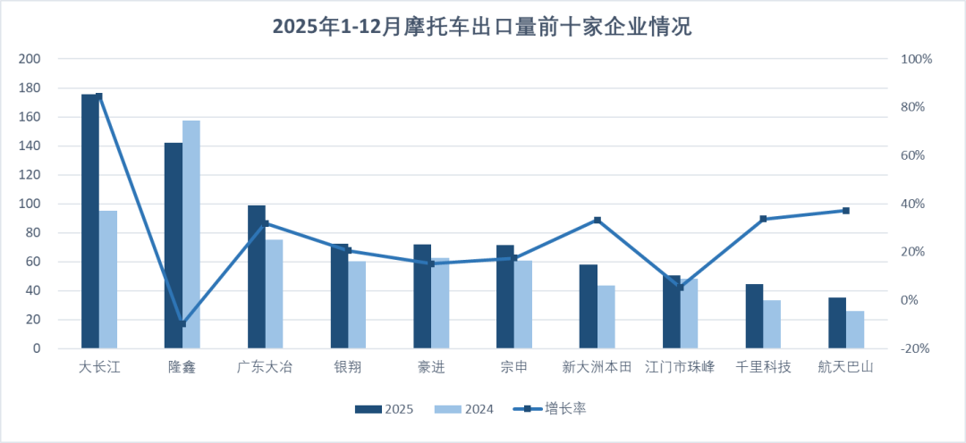 1-12月,摩托车出口量排名前十位的企业依次为:大长江、隆鑫、广东大冶、重庆银翔、广州豪进、宗申、新大洲本田、江门市珠峰、重庆千里科技、航天巴山,上述十家企业共出口821.25万辆,占摩托车出口总量的61.44%。