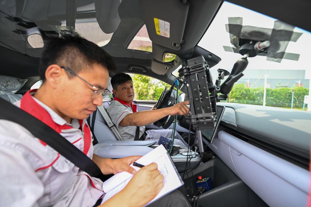 测试员在一辆智能网联汽车内做测试。新华社记者孙凡越摄