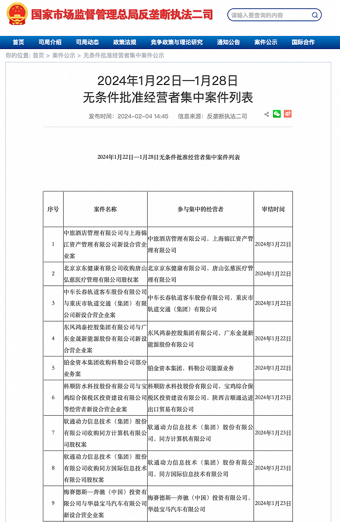 2月4日,国家市场监管总局公布2024年1月22日—1月28日无条件批准经营者集中案件列表,其中批准梅赛德斯-奔驰(中国)投资有限公司与华晨宝马汽车有限公司新设合营企业案,审结时间为1月23日。