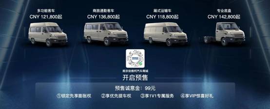 依维柯全新得意预售仍在火热进行中,预售价格为11.88万元起,你只需99元诚意金,就能够尊享南京依维柯官方提供的“优先提车权、订金膨胀权、1对1专属服务、VIP惊喜好礼”等多重限时钜惠福利!