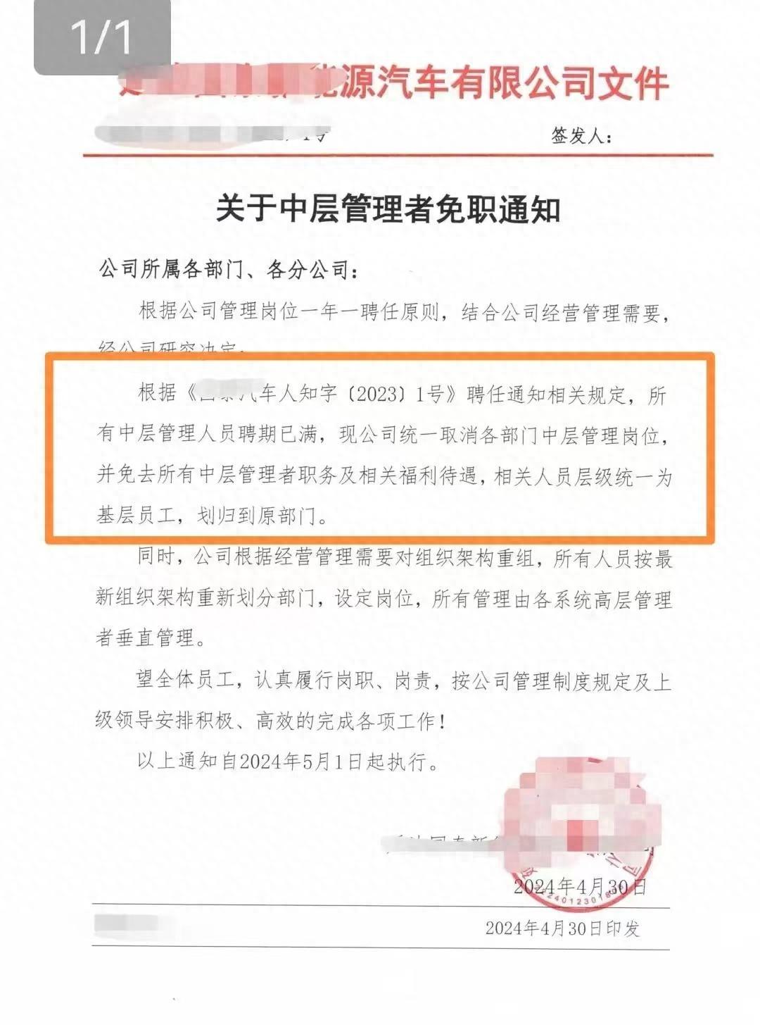 一新能源车企将所有中层管理者免职 涉及10几人降为基层员工