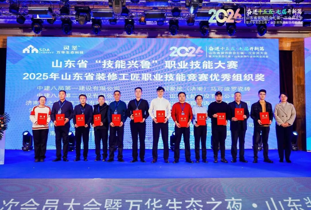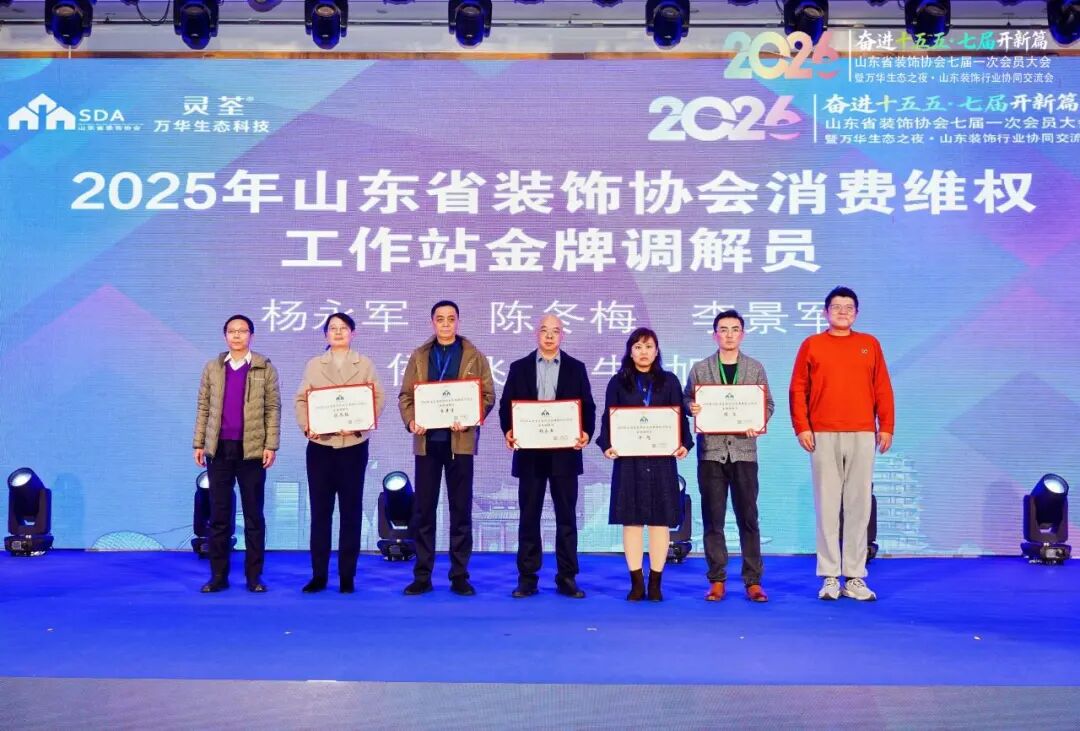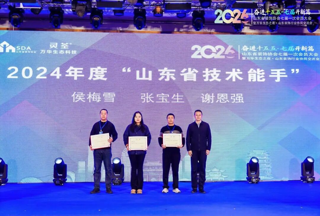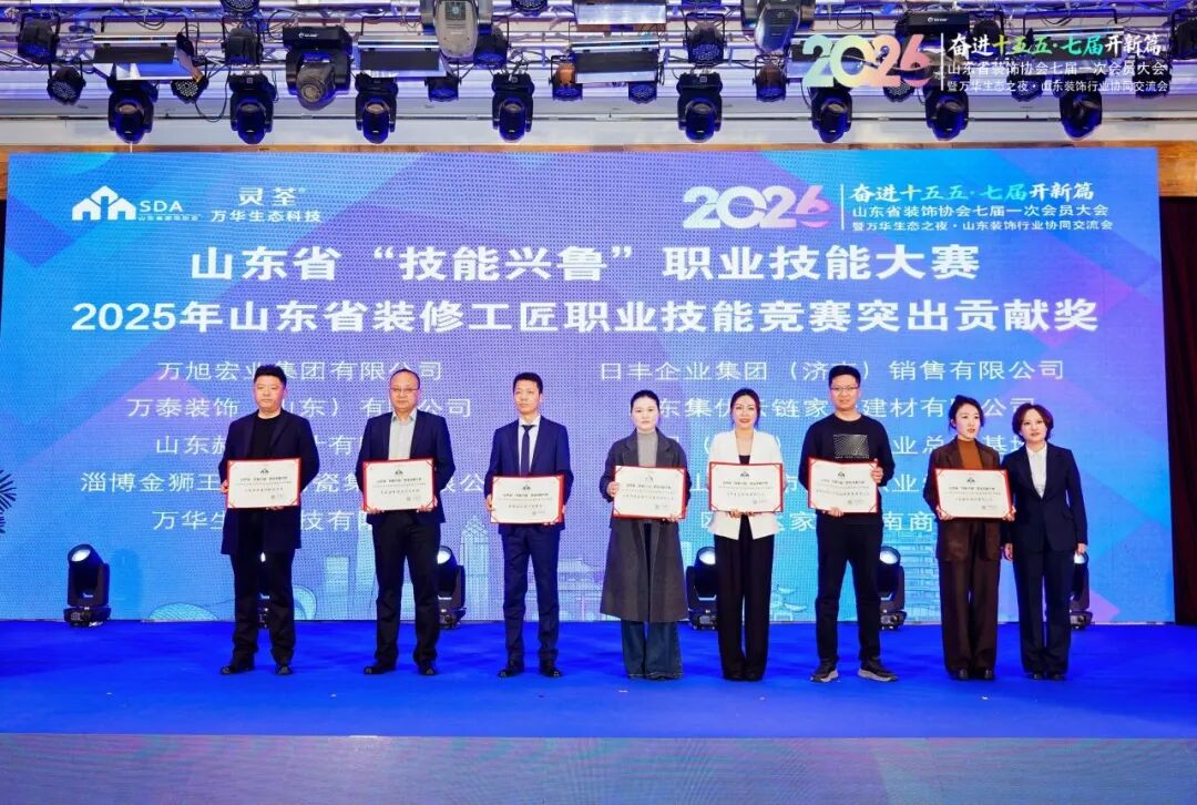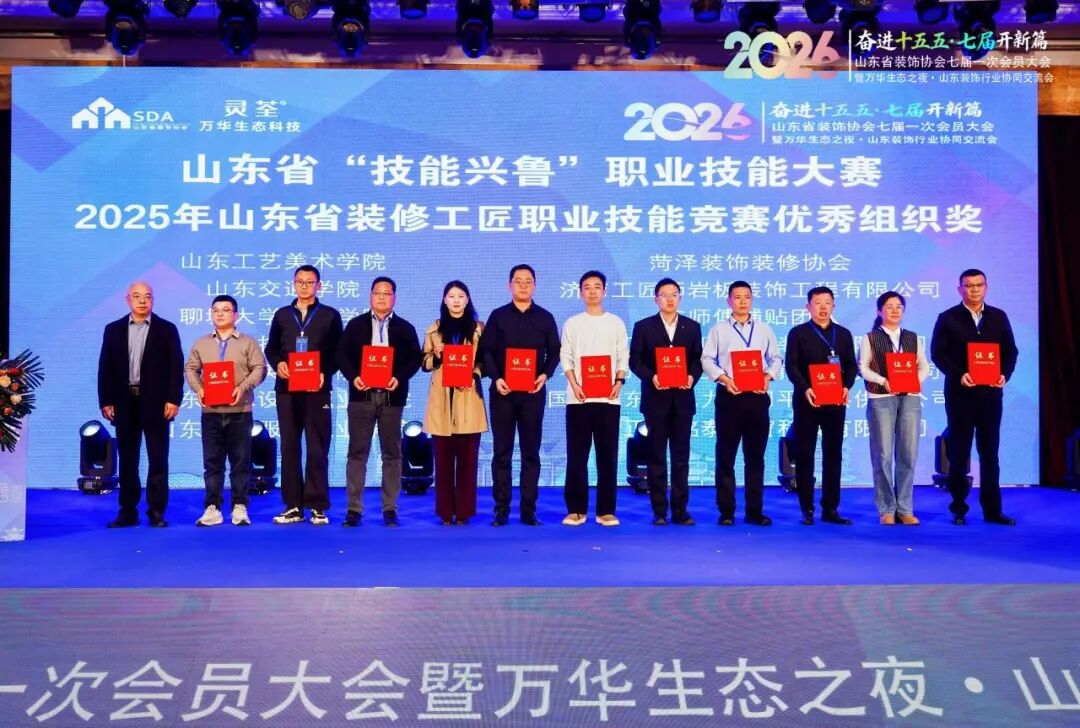 为荣获山东省技术能手、山东省轻工系统首席技师称号的行业优秀从业者颁发证书,表彰先进、树立标杆,充分激发行业人才创新创造活力;为2025年度山东省装饰协会消费维权工作站金牌调解员授证,持续强化行业消费维权服务能力,切实保障消费者与行业企业合法权益;为在山东省“技能兴鲁”大赛中表现突出的单位颁发突出贡献奖及优秀组织奖,表彰其在技能人才培养、赛事组织开展等方面的积极贡献,推动行业技能竞赛常态化、专业化发展。