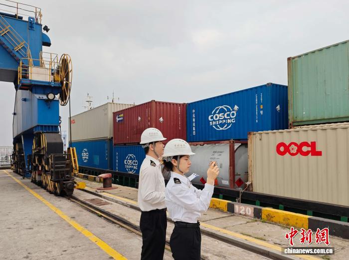 黄埔新港海关关员对进口“水水中转”多式联运集装箱进行监管。黄捷摄