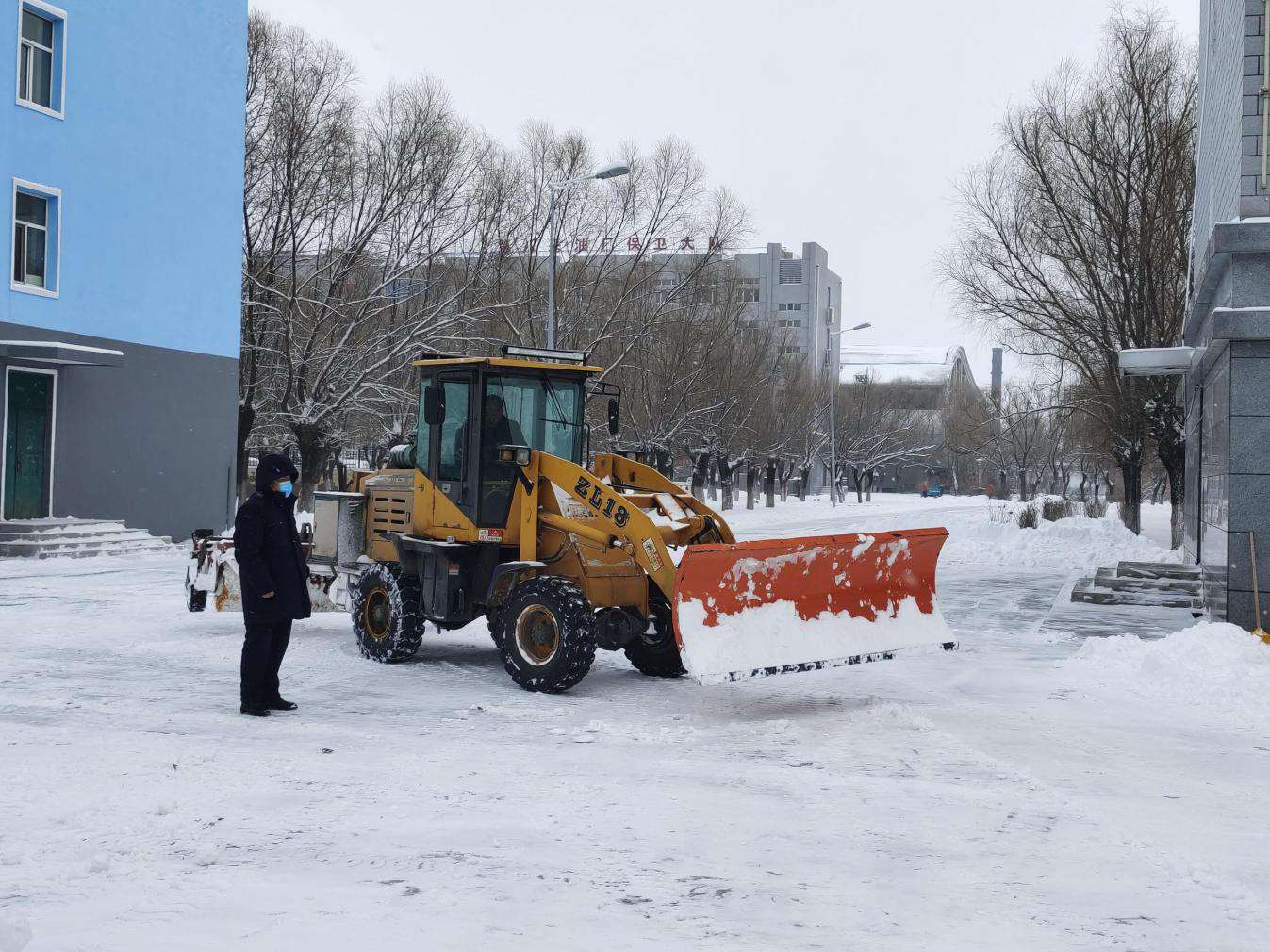 由机关人员封锁道路、车辆引导、班组长现场监督,本次清雪累计工作时长近24小时,出动人员20人,清雪设备5台,保障车辆5台,使用融雪剂8吨,清理路面10公里,各办公区场所累计万余平