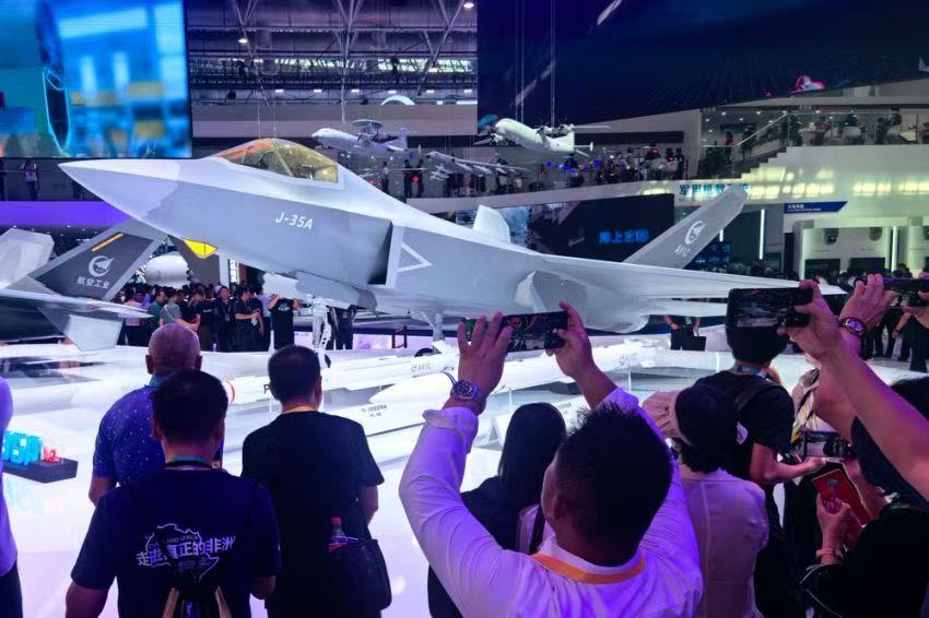 航展现场,人头攒动,走进航空馆,新一代隐身战机歼35A模型在馆内中央位置展示,航母编队的核心武器装备歼15T战机,同歼-16系列、歼-11B等飞机模型共同组成“新质战斗力”机群