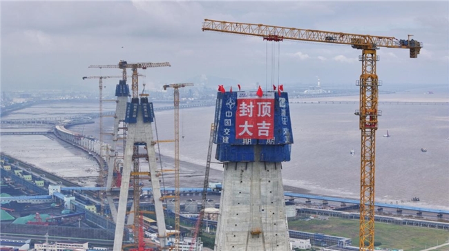 浙江杭甬高速宁波三期工程甬江特大桥主塔封顶