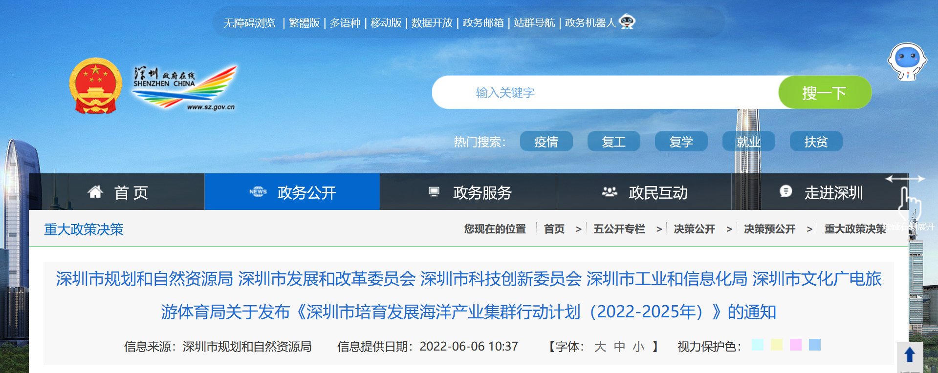 深圳市规划和自然资源局 深圳市发展和改革委员会 深圳市科技创新委员会 深圳市工业和信息化局 深圳市文化广电旅游体育局关于发布《深圳市培育发展海洋产业集群行动计划(2022-2025年)》的通知
