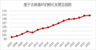 从2007年到2022年间,创业孵化生态环境增长率综合指数都在100以上,表明创业孵化生态环境指数一直保持增长的趋势,整体发展环境良好,但增长速度有较大的差异