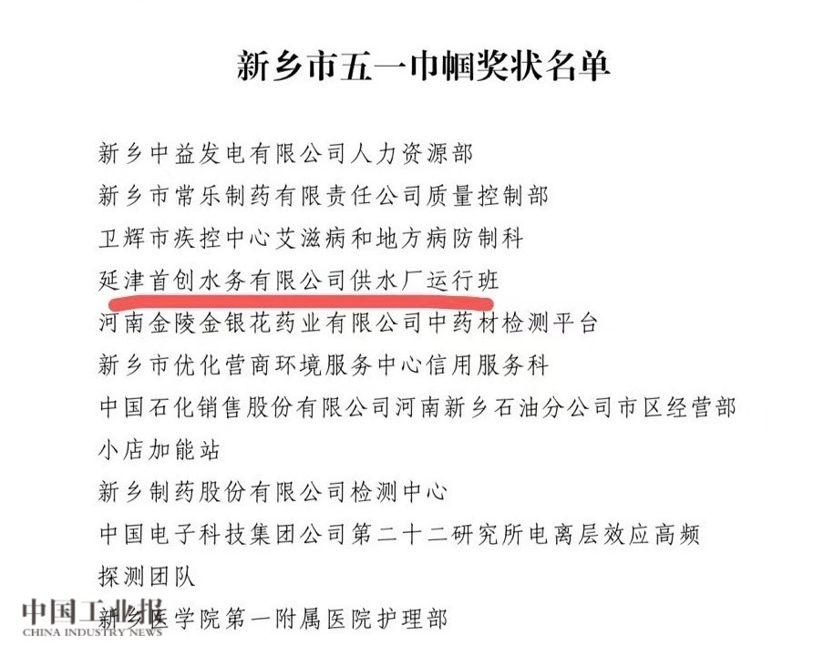 3月4日,河南省新乡市总工会授予河南省延津首创水务有限公司的延津首创供水厂运行班“新乡市五一巾帼奖状”,表彰她们用实际行动诠释了劳动光荣、知识崇高、人才宝贵、创造伟大的价值追求,充分彰显了新时代女职工的巾帼力量和风采。