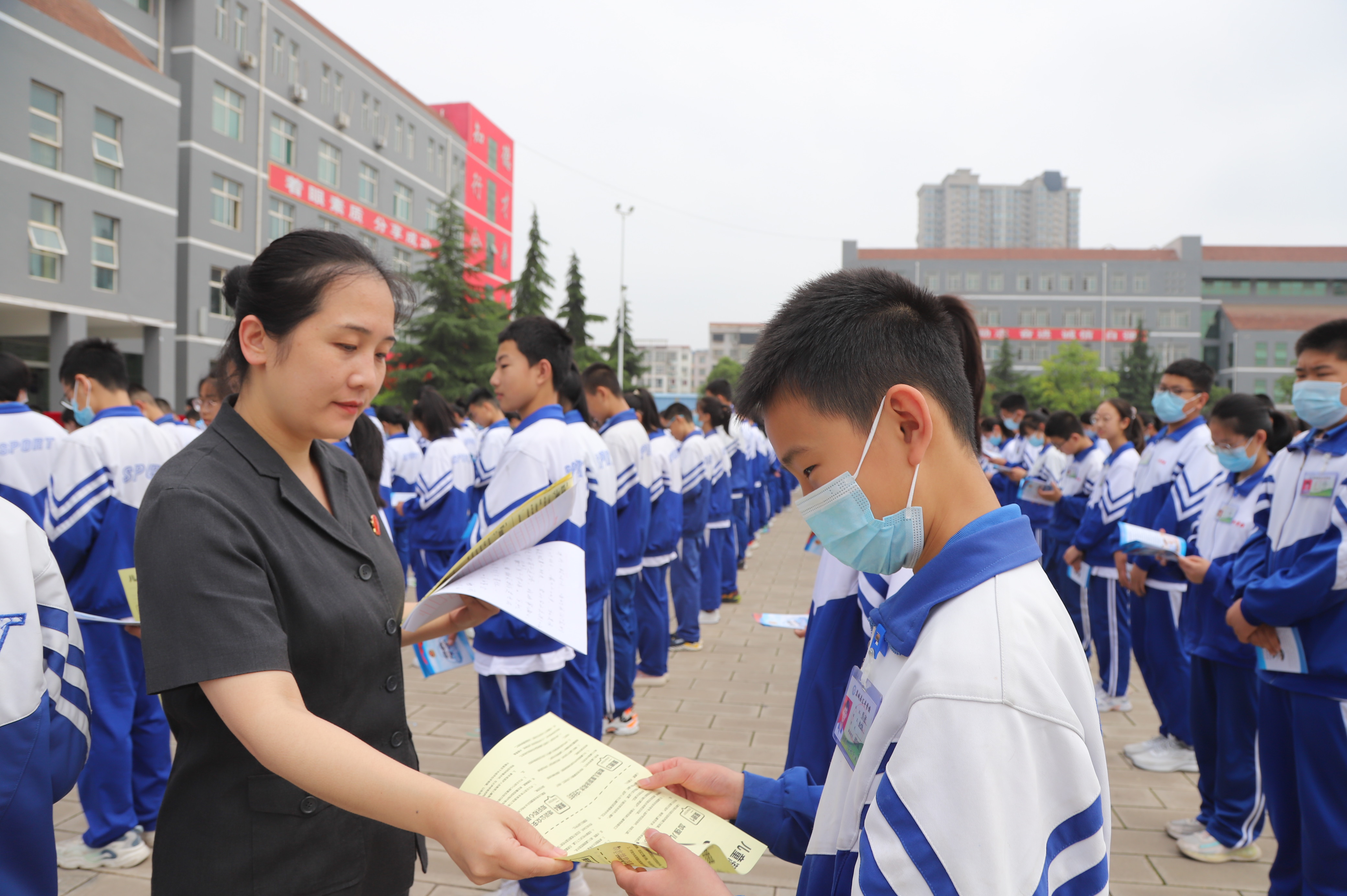 图为丁雪红法官给翼城县第五中学的学生发放宣传资料