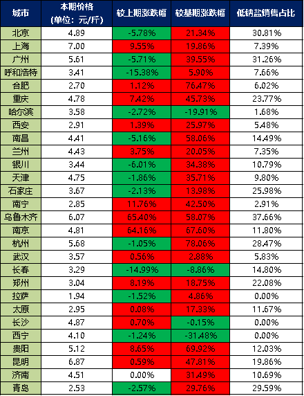 分价格区间来看,本期超市食用盐销售单价在5元/斤以上的城市有6个,分别是上海、广州、乌鲁木齐、杭州、贵阳、昆明;超市食用盐销售单价在4-5元/斤之间的城市有9个,分别是北京、重庆、南昌、兰州、天津、南京、长沙、西宁、济南;超市食用盐销售单价在3-4元/斤之间的城市有7个,分别是呼和浩特、哈尔滨、银川、石家庄、武汉、长春、郑州;超市食用盐销售单价在3元/斤以下的城市有6个,分别是合肥、西安、南宁、拉萨、太原、青岛。