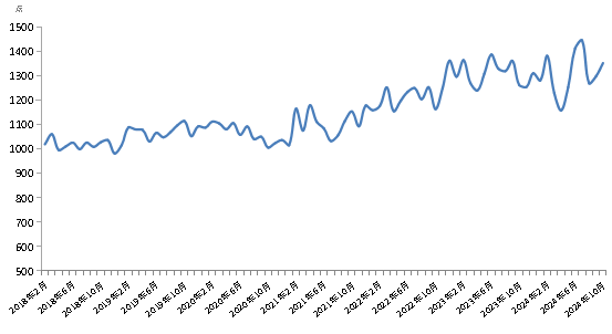 10月份,新华·中盐食用盐(商超)价格指数报1352.74点,较上期(2024年9月)上涨54.74点,涨幅4.22%;较基期(2018年1月)上涨352.74点,涨幅35.27%;较周期内最高点1445.75点(2024年7月)下跌93.01点,跌幅6.59%;较周期内最低点981.91点(2018年12月)上涨370.83点,涨幅37.77%。