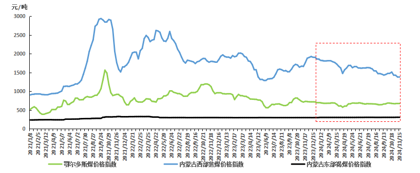 12月2日,内蒙古煤炭价格指数最新成果在2024年企业家博鳌论坛上正式发布。监测结果显示,2024年,在国内煤炭供需结构宽松背景下,内蒙古动力煤年内运行相对稳定,但较上年均价有所下跌,西部焦煤价格在下游需求走弱背景下震荡回落。