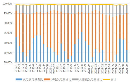 从发电端看,内蒙古是国家重要能源和战略资源基地,凭借其丰富的能源资源优势,火力发电、风力发电、光伏发电协同发力,且新能源发电量增长较快。1-9月份火电发电量同比增长6.22%,风电、太阳能发电分别同比增长21.73%、34.47%。新能源与传统能源作为全区现代能源体系有机整体,整体呈现互补态势,错峰出力,支撑电力保供工作,不断维护新型电力系统安全稳定。