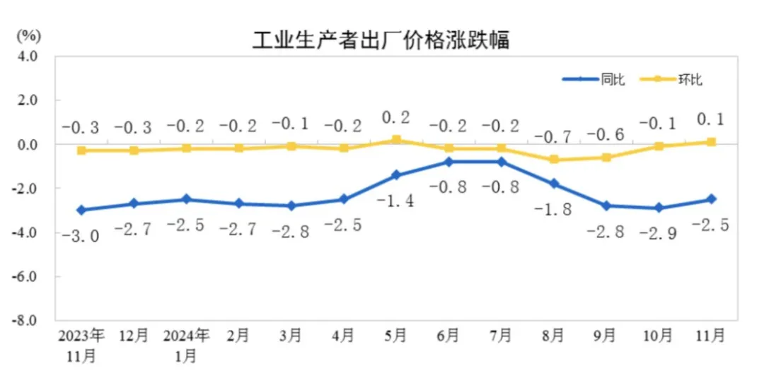 从同比看,11月份,PPI同比下降2.5%,降幅比上月收窄0.4个百分点。其中,生产资料价格同比下降2.9%,降幅比上月收窄0.4个百分点;生活资料价格同比下降1.4%,降幅收窄0.2个百分点。