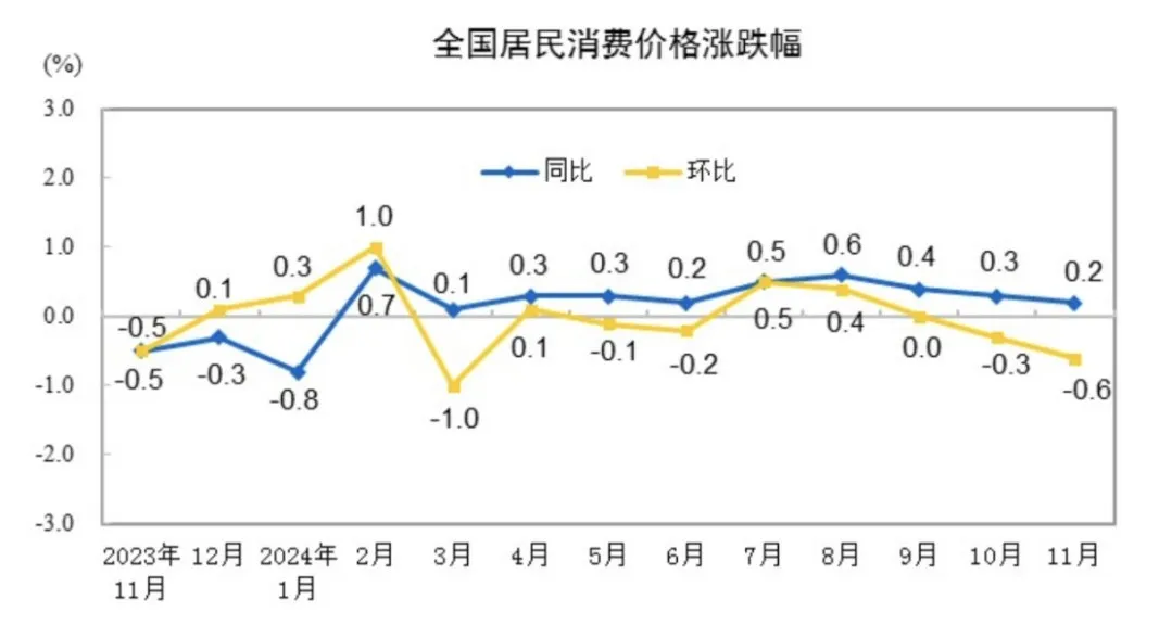 国家统计局12月9日发布数据显示,11月份,全国居民消费价格指数(CPI)同比上涨0.2%,环比下降0.6%;工业生产者出厂价格指数(PPI)同比下降2.5%,环比上涨0.1%。
