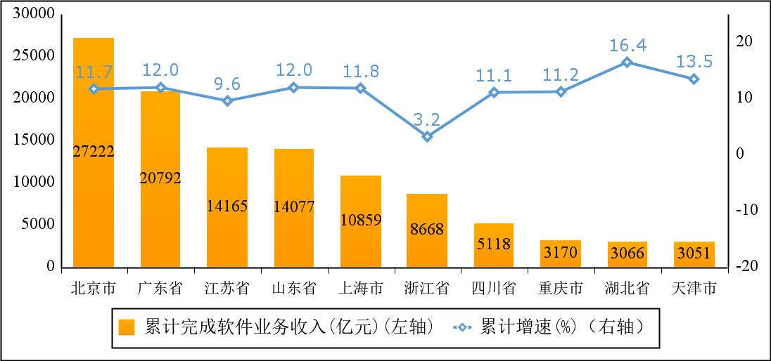 主要软件大省收入占比保持稳定。前11个月,北京、广东、江苏、山东、上海软件业务收入居全国前五,分别同比增长11.7%、12.0%、9.6%、12.0%和11.8%,5省(市)合计软件业务收入87113亿元,占全国比重为70.9%,占比较前10个月回落0.3个百分点。