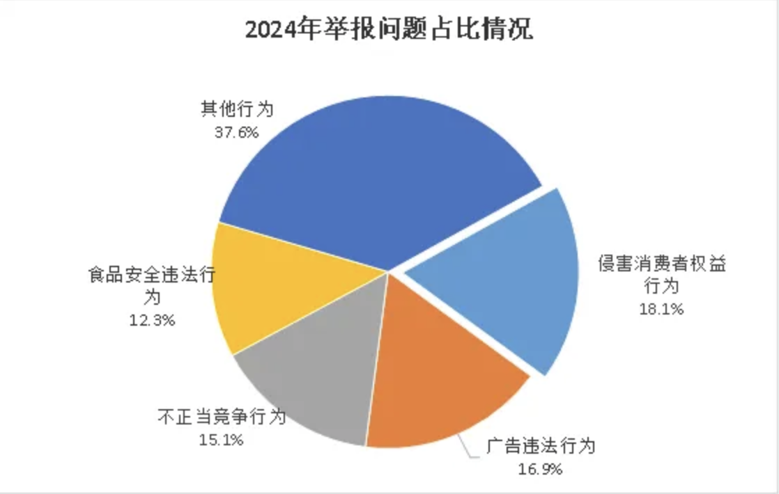 2024年,全国市场监管部门共核查举报546.9万件,同比增长7.9%。从举报问题来看,侵害消费者权益行为(99.1万件)、广告违法行为(92.6万件)、不正当竞争行为(82.4万件)、食品安全违法行为(67.5万件)排名靠前,分别占比18.1%、16.9%、15.1%、12.3%。上述四类违法行为中,仅广告违法行为举报同比下降20.3%。近年来,市场监管总局发布《广告绝对化用语执法指南》,细化了绝对化用语的审查范围和处罚适用情形,取得了明显成效。2024年广告违法行为举报总量持续下降,全国12315平台(以下简称平台)数据显示,针对广告极限词、禁用词等绝对化用语的举报较上一年减少15万余件。