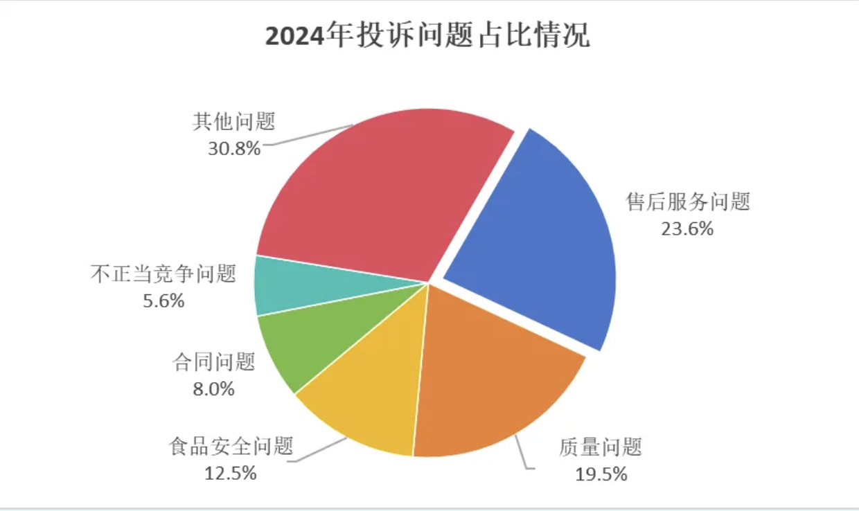 2024年,全国市场监管部门共受理消费者投诉1862.5万件,同比增长7%。从投诉问题来看,售后服务问题(440.3万件)、质量问题(363万件)、食品安全问题(232.7万件)、合同问题(149.8万件)、不正当竞争问题(104.1万件)等相对突出,分别占比23.6%、19.5%、12.5%、8%、5.6%。其中,售后服务问题诉求量已连续两年居于首位,均超过400万件。消费者反映的主要问题为不退款、不发货、不履行“三包”义务等。此外,在电商售后服务领域,“智能客服”备受消费者诟病,相关投诉6969件,同比增长56.3%。消费者普遍反映“智能客服”答非所问、人工客服难联系,导致沟通效率低下,严重影响消费体验。